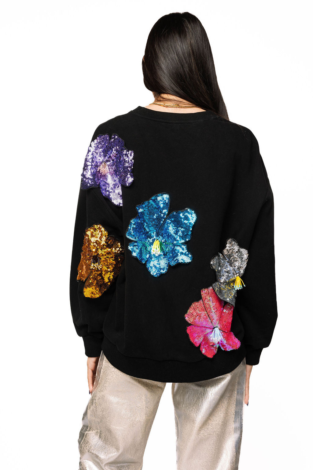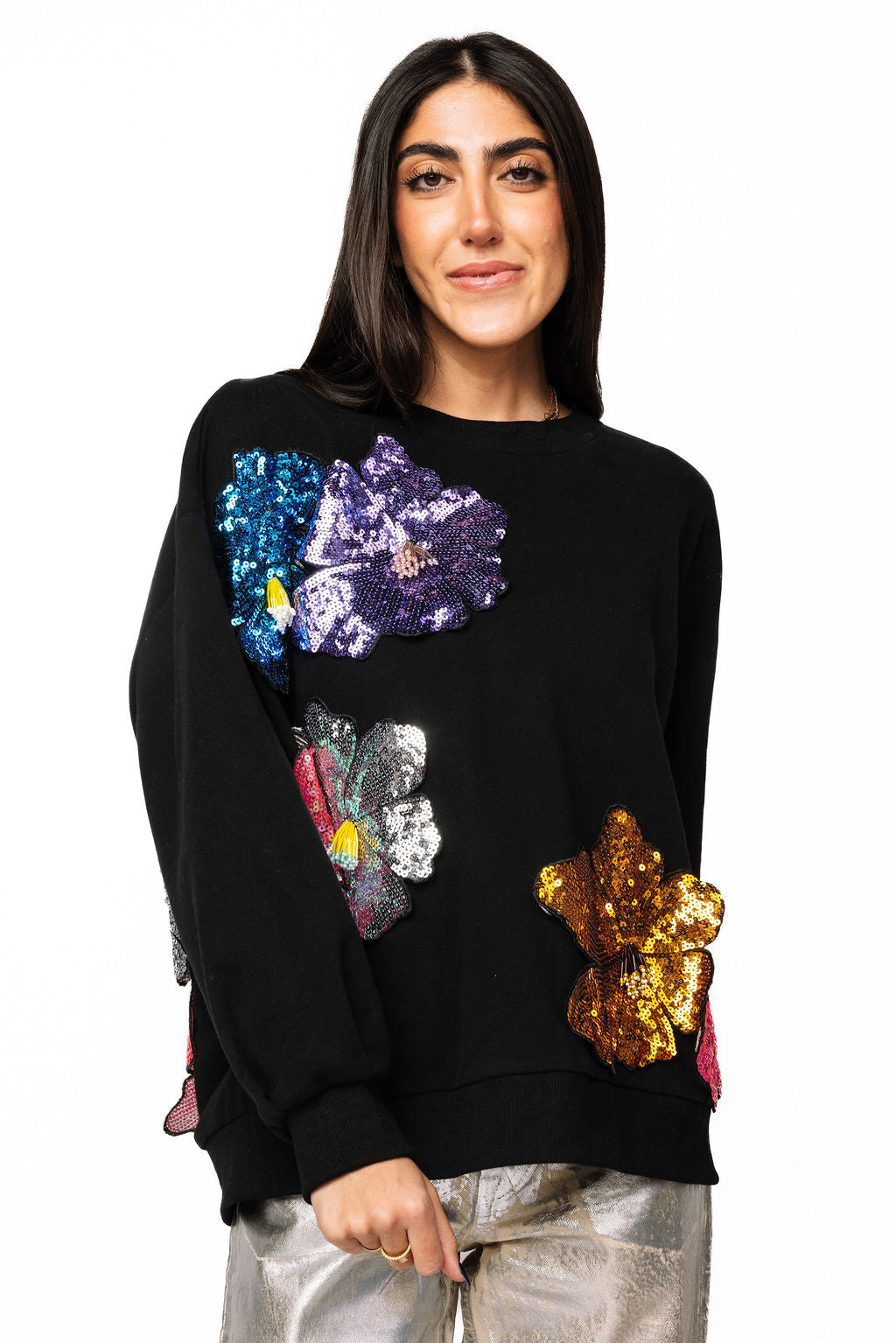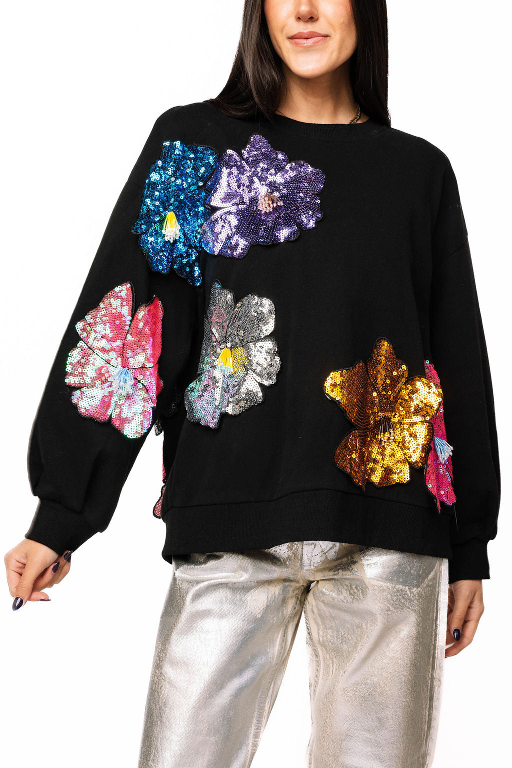 Make a statement in this black sweatshirt that's anything but basic. Oversized 3D sequin flowers bloom across the front and back in a riot of color, catching light with every move. Perfect for adding instant personality to your everyday look—whether you're keeping it casual or turning heads. Comfort meets sparkle in one show-stopping piece.