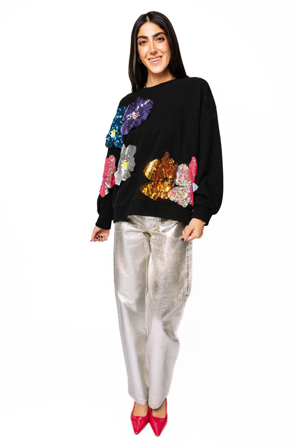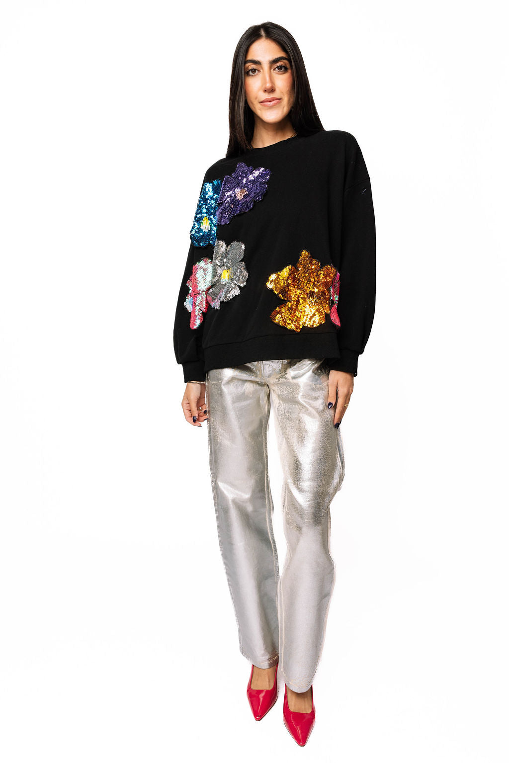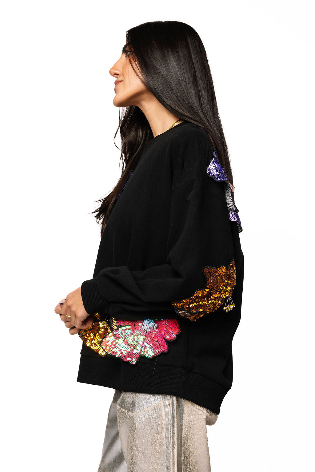 Make a statement in this black sweatshirt that's anything but basic. Oversized 3D sequin flowers bloom across the front and back in a riot of color, catching light with every move. Perfect for adding instant personality to your everyday look—whether you're keeping it casual or turning heads. Comfort meets sparkle in one show-stopping piece.
