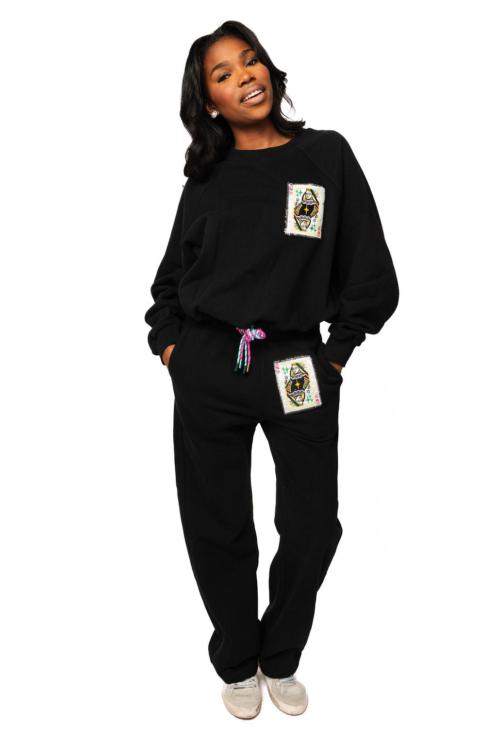 Black QOS Queen Card Rhinestone Tie Sweatshirt