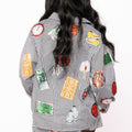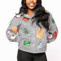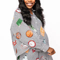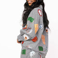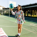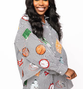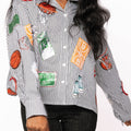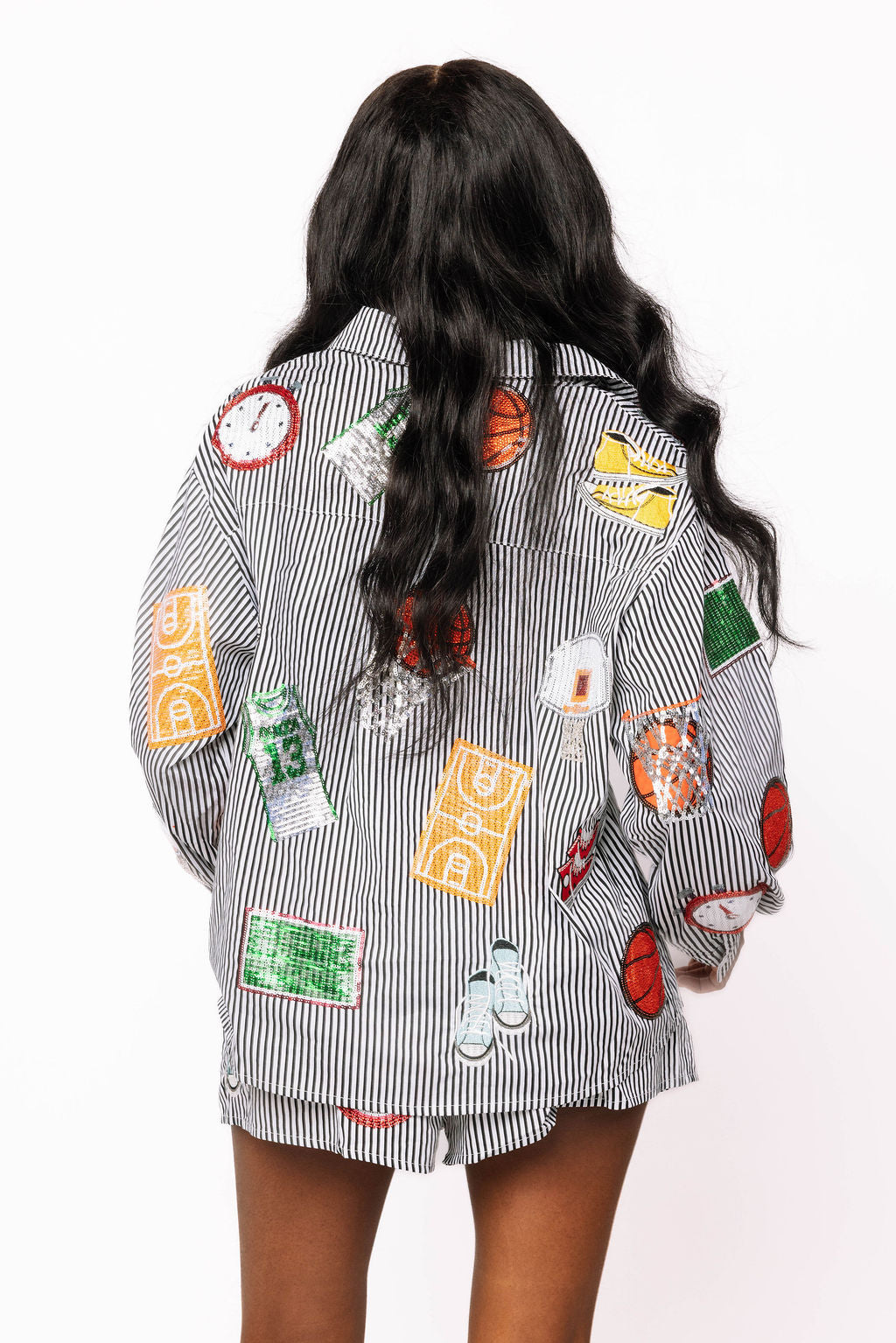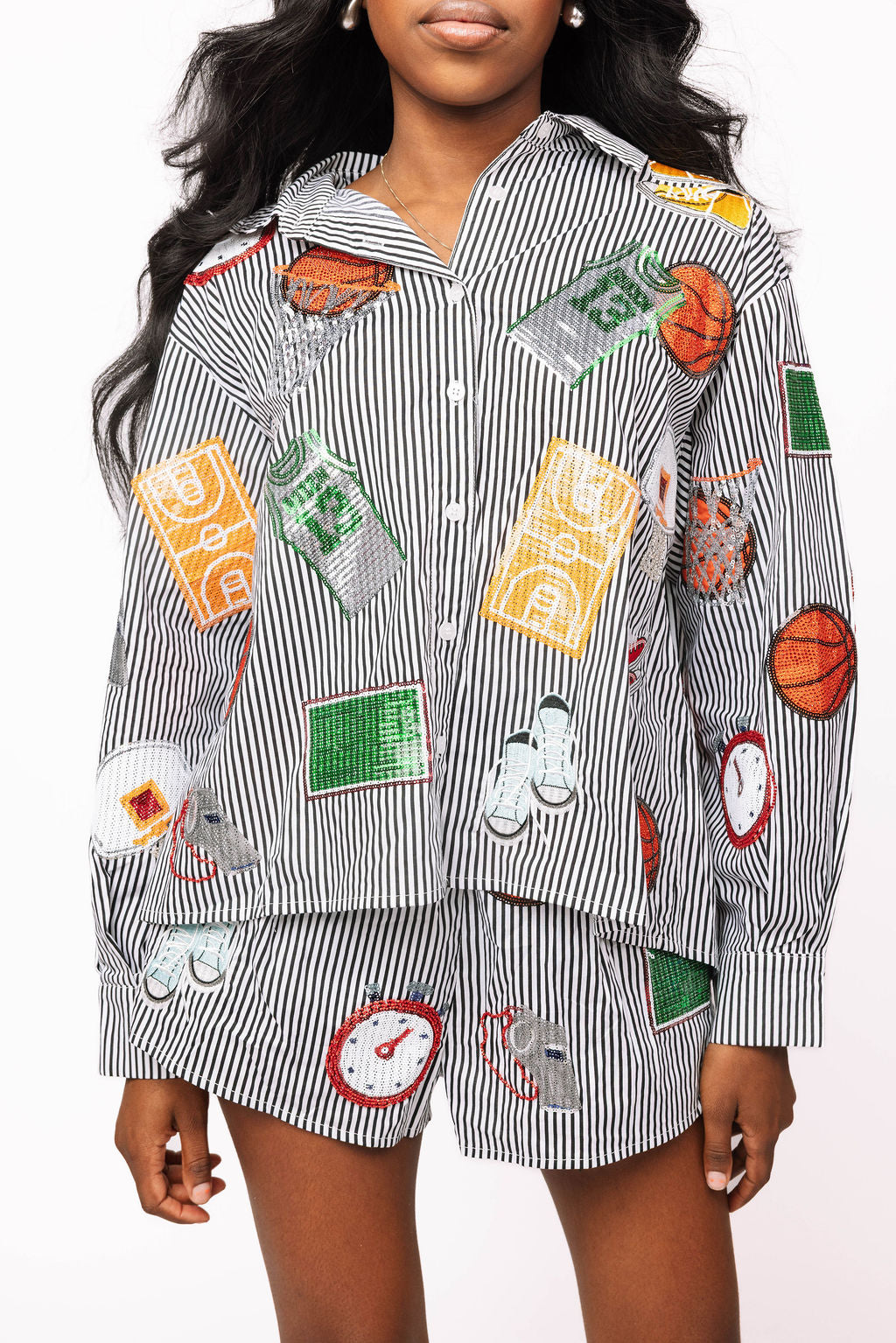 Game on in this playful button-up top featuring white and black stripes paired with shimmering sequin basketball icons—sneakers, courts, game timers, and more. Perfect for court-side style or casual court vibes, this piece brings major sparkle to your athletic aesthetic. Mix and match with the coordinating shorts to complete your championship-ready ensemble.