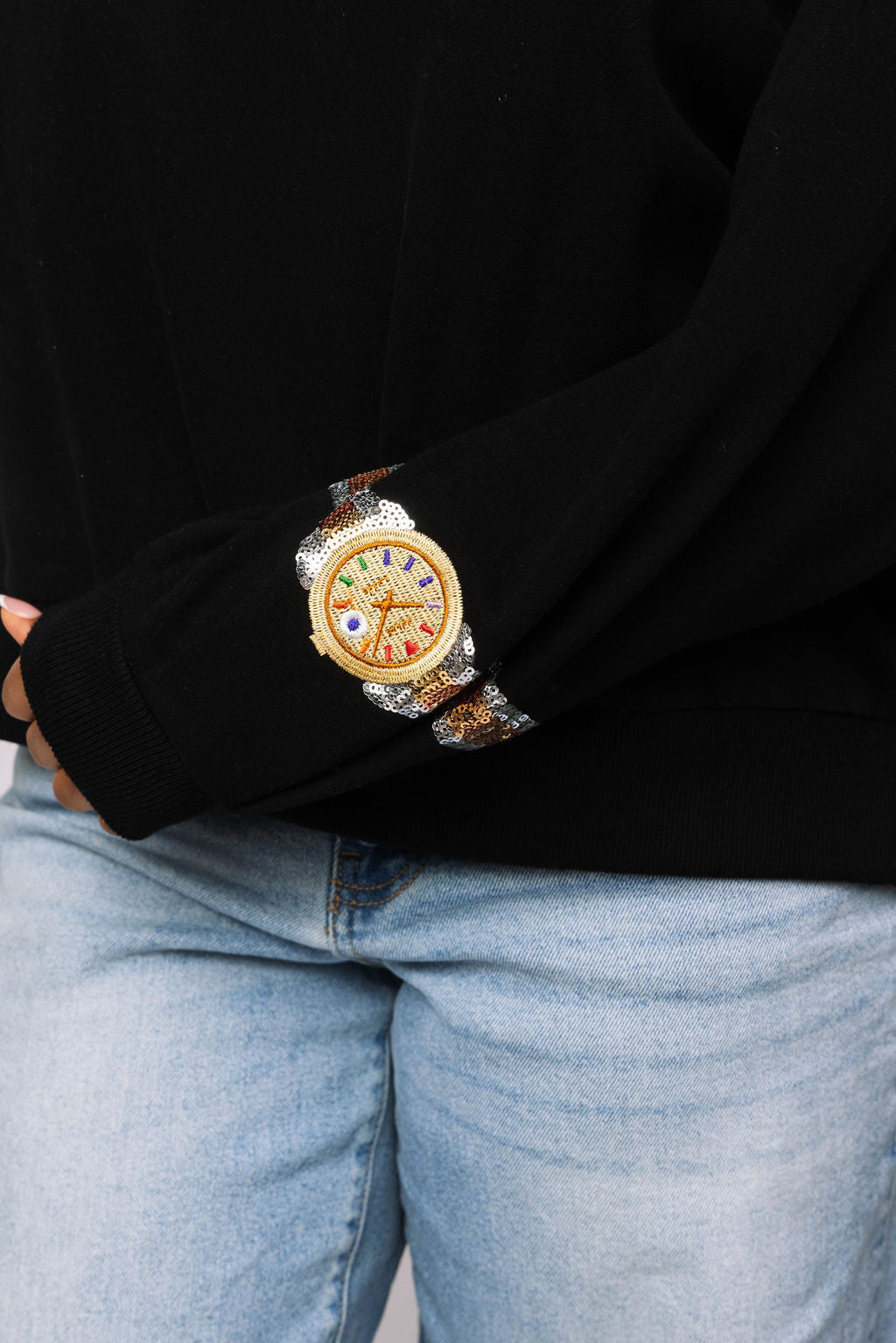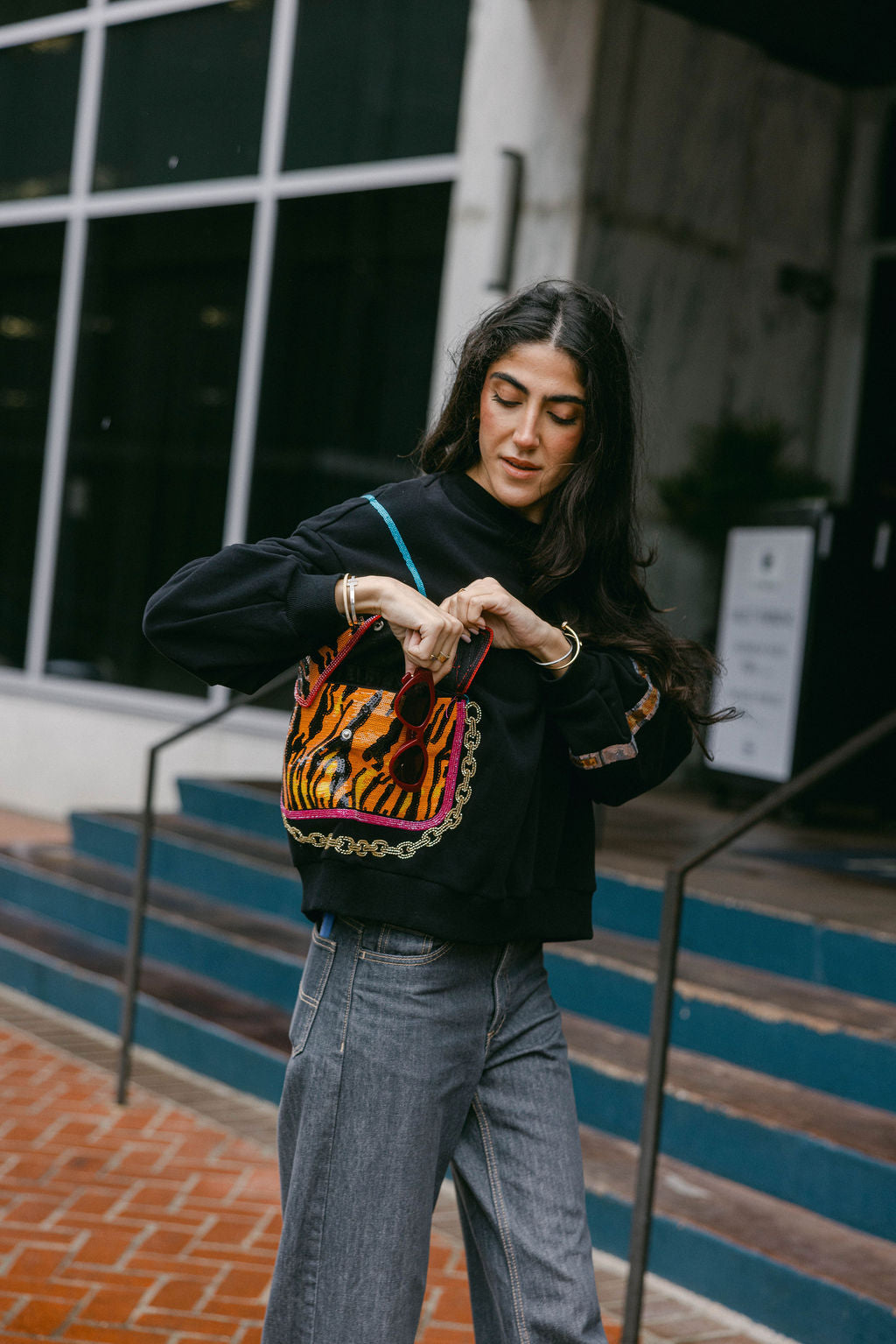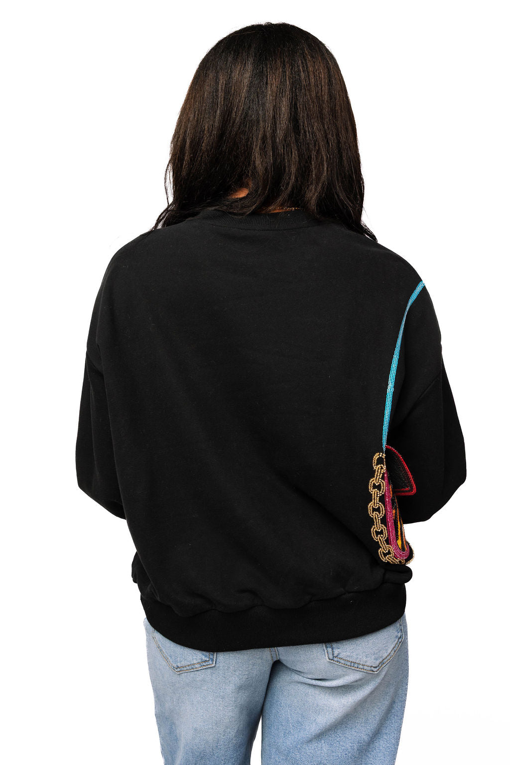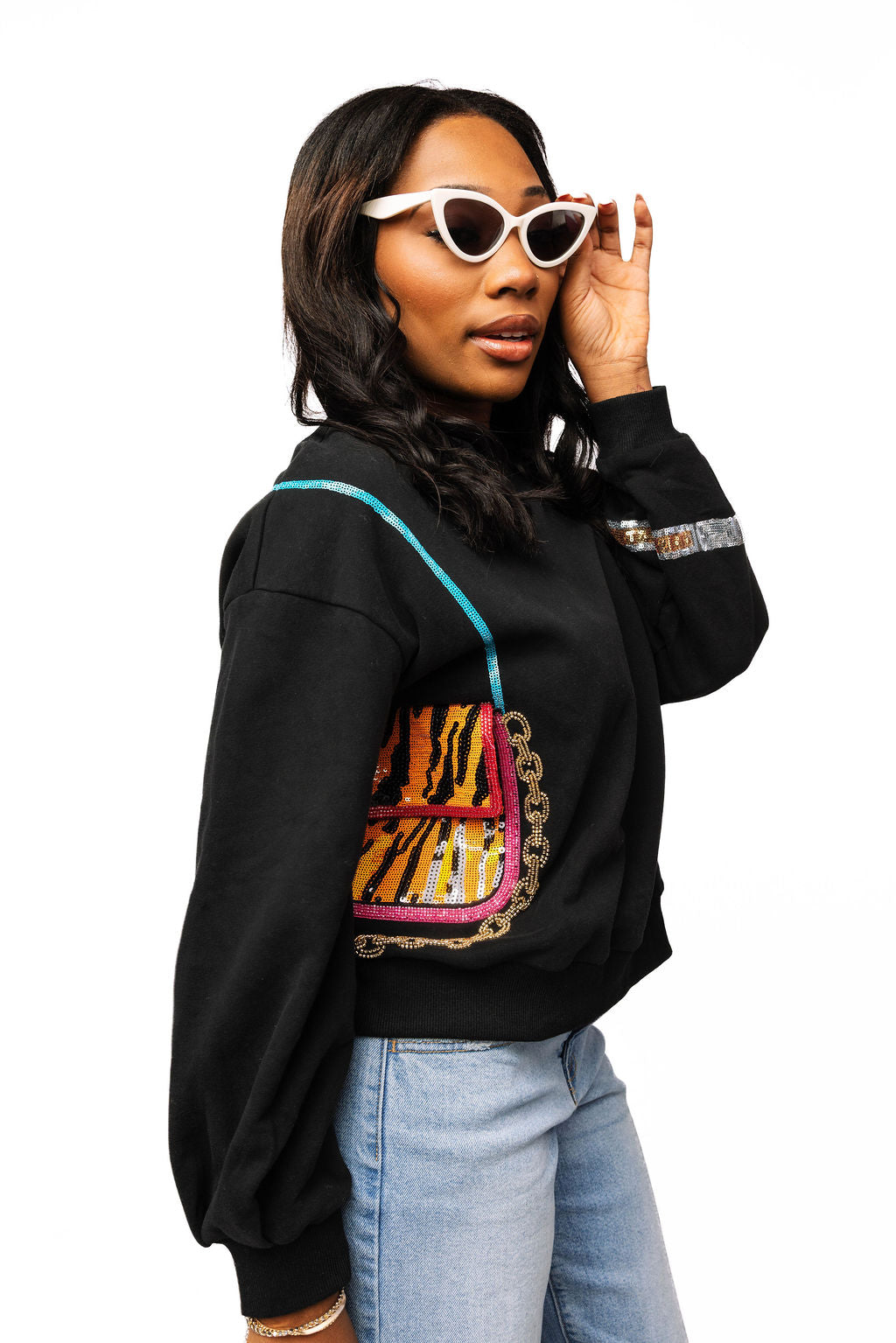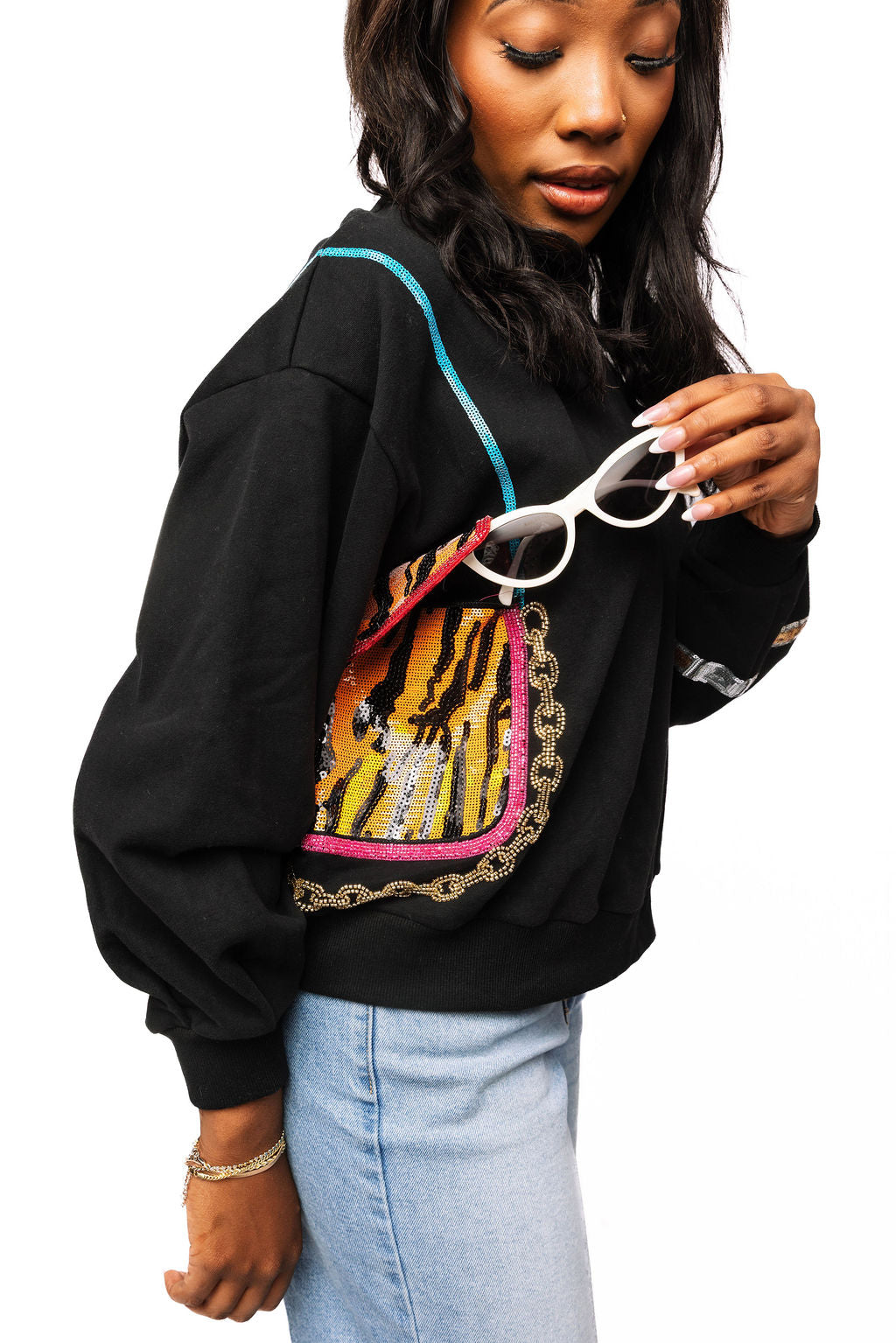 Rock a bold statement with this black sweatshirt featuring a tiger print purse design positioned under the arm—complete with a functional purse pocket for stashing your essentials. A chic watch design adorns the left wrist, adding an extra touch of style. Perfect for those who love mixing fashion with fun, this piece lets you wear your accessories in the most creative way possible.