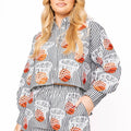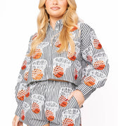 Shoot hoops in style with this playful black and white striped button-up top featuring an all-over basketball and hoop design. Perfect for court-side vibes or casual game day looks, this piece brings sporty fun to your wardrobe. Mix and match with our coordinating shorts to complete the full ensemble and show off your love for the game!
