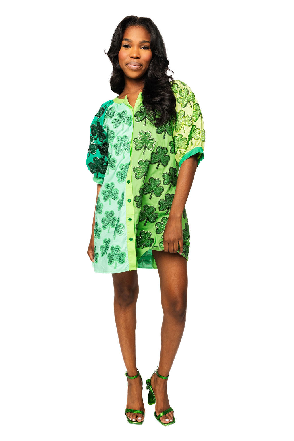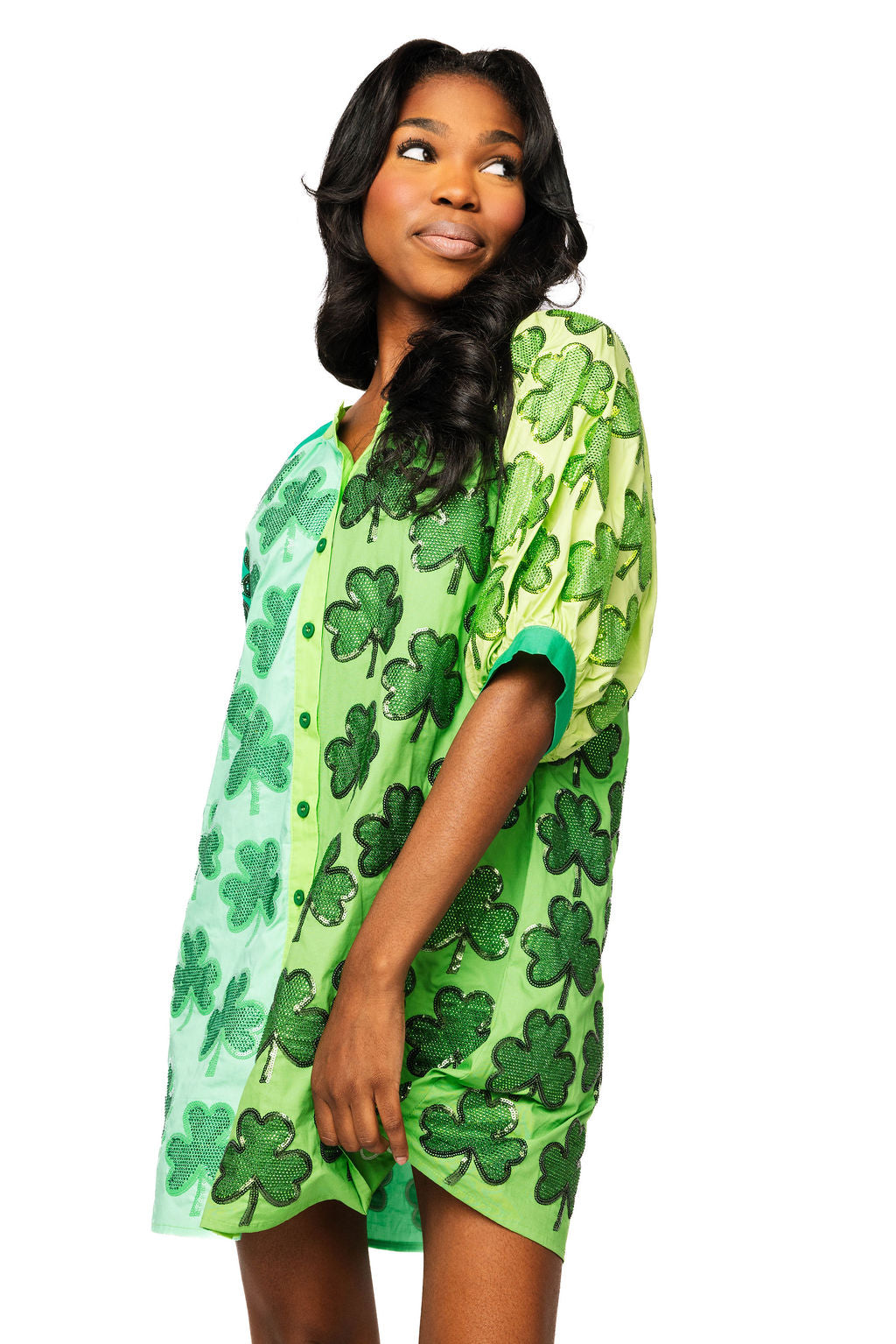 Get lucky in this vibrant green cotton colorblock dress that's anything but ordinary! Featuring dazzling rhinestone shamrocks design that catches the light with every move, this button-up style brings festive flair to your everyday wardrobe. The comfortable short sleeves make it perfect for layering or wearing solo, while the colorblock pattern adds modern edge to a classic silhouette. Whether you're celebrating the season or just want to sparkle with personality, this dress delivers charm and shine in one fabulous package.