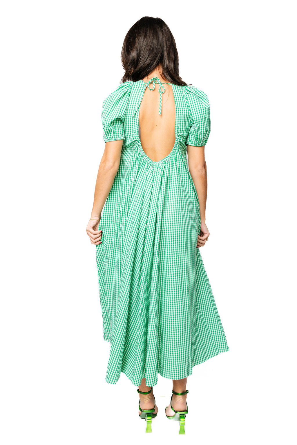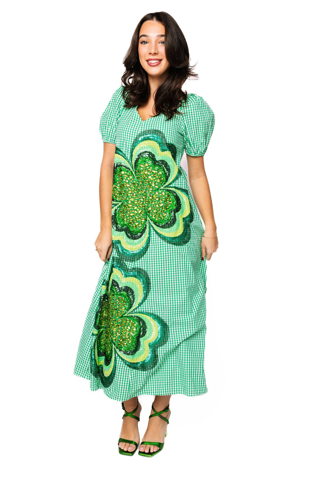 Celebrate in style with this charming green gingham midi dress, perfect for spring festivities and beyond. Crafted from lightweight cotton, the flowy silhouette moves beautifully with every step, while a jeweled shamrock design adds a touch of sparkle and personality. The tie back detail creates an elegant, adjustable fit that flatters any figure. Whether you're heading to a parade or a garden party, this dress brings effortless charm and a hint of shimmer to your wardrobe.
