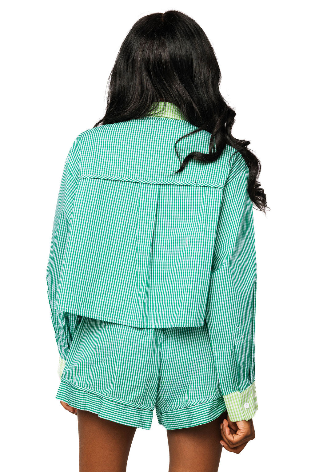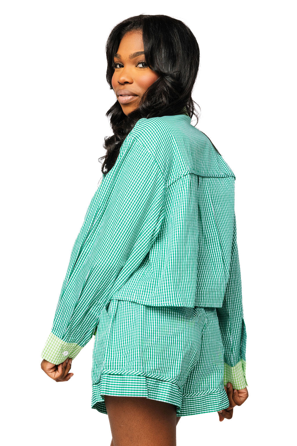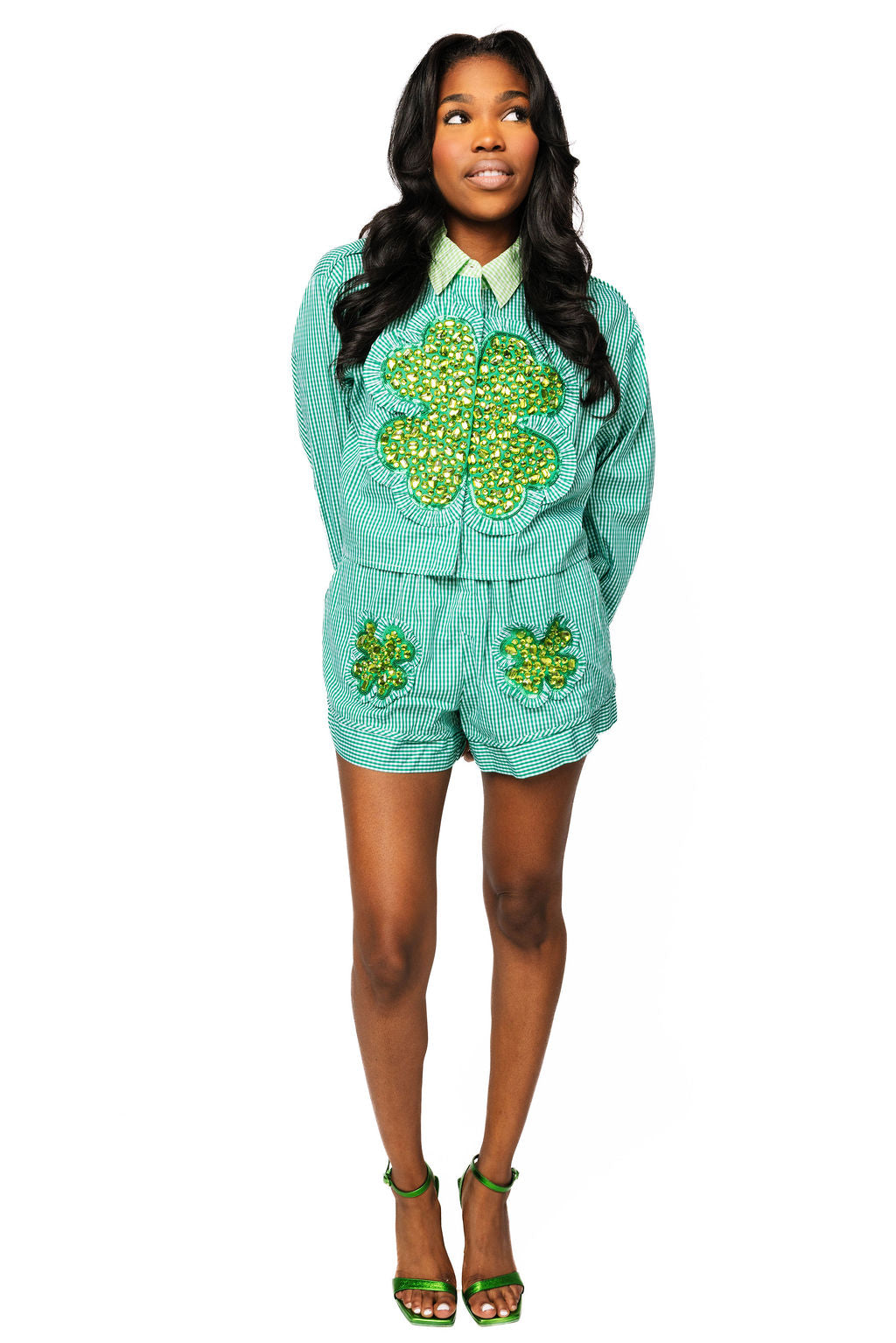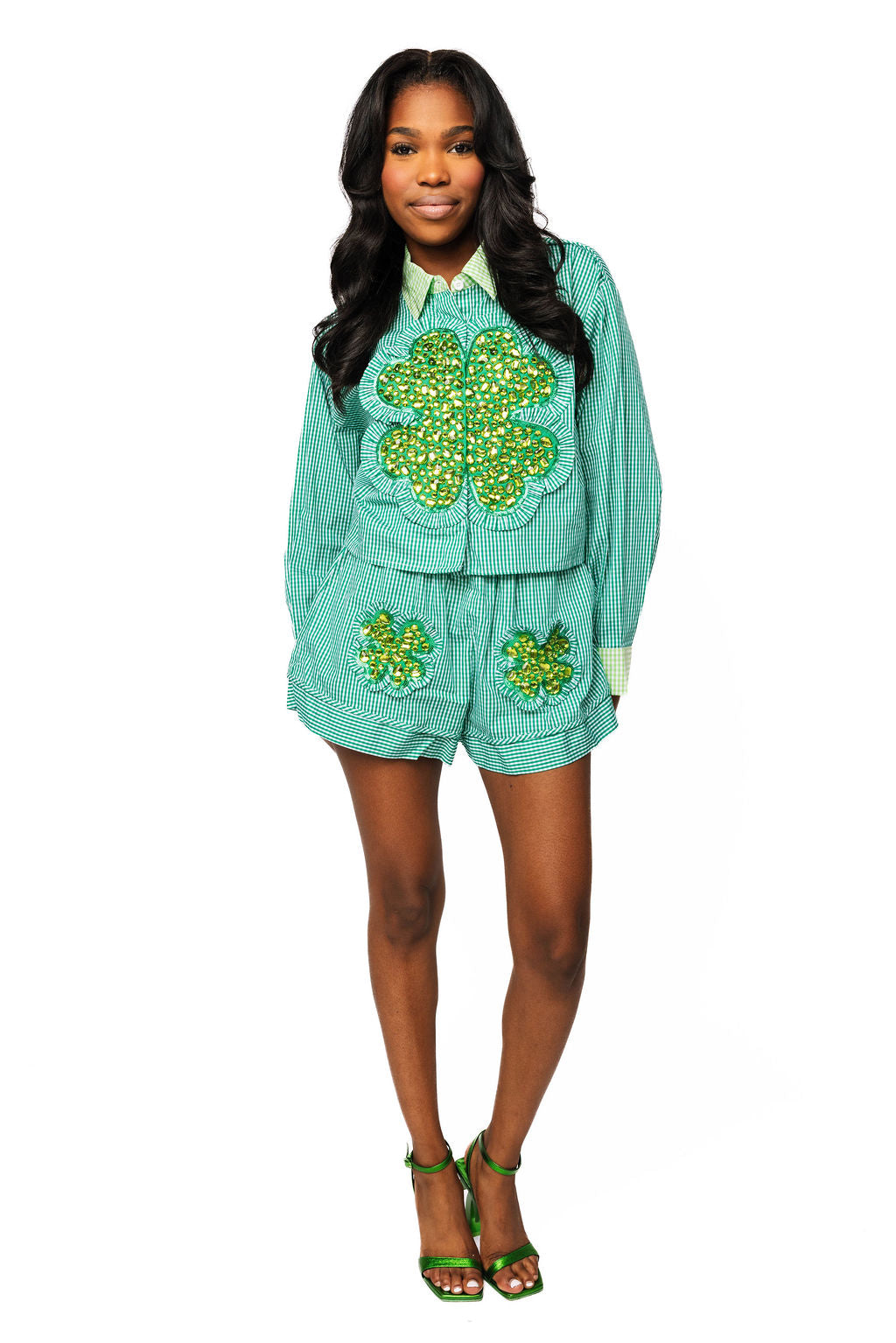 Luck meets style in these vibrant green gingham shorts, adorned with two dazzling jeweled shamrocks that catch the light with every move. The playful ruffle detailing adds a flirty touch perfect for spring celebrations or everyday sparkle. Pair with the matching shirt to complete your coordinated look and shine from head to toe.