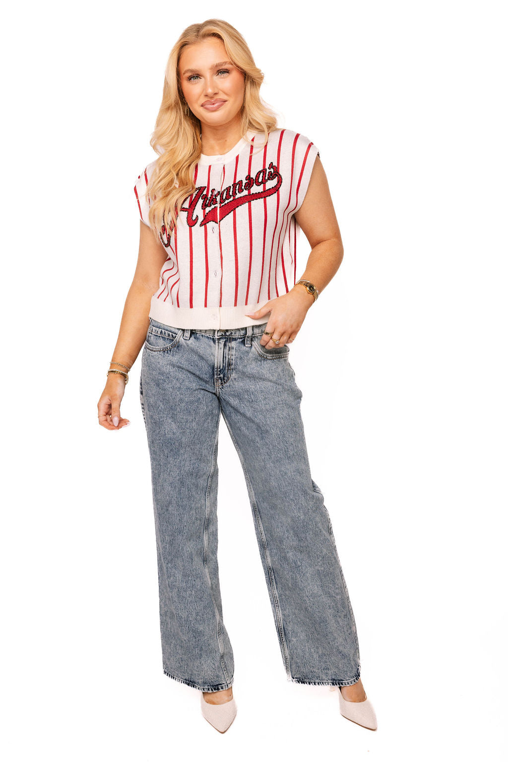 Show your Razorback pride with this licensed Arkansas striped button-up knit vest. Featuring the iconic "Arkansas" text across the front, it's the ultimate game-day essential for fans heading to the ballpark. The classic striped knit design offers comfortable layering that works whether you're cheering in the stands or tailgating with friends. Perfect for any season, this versatile piece lets you rep your team in style while staying cozy and put-together.