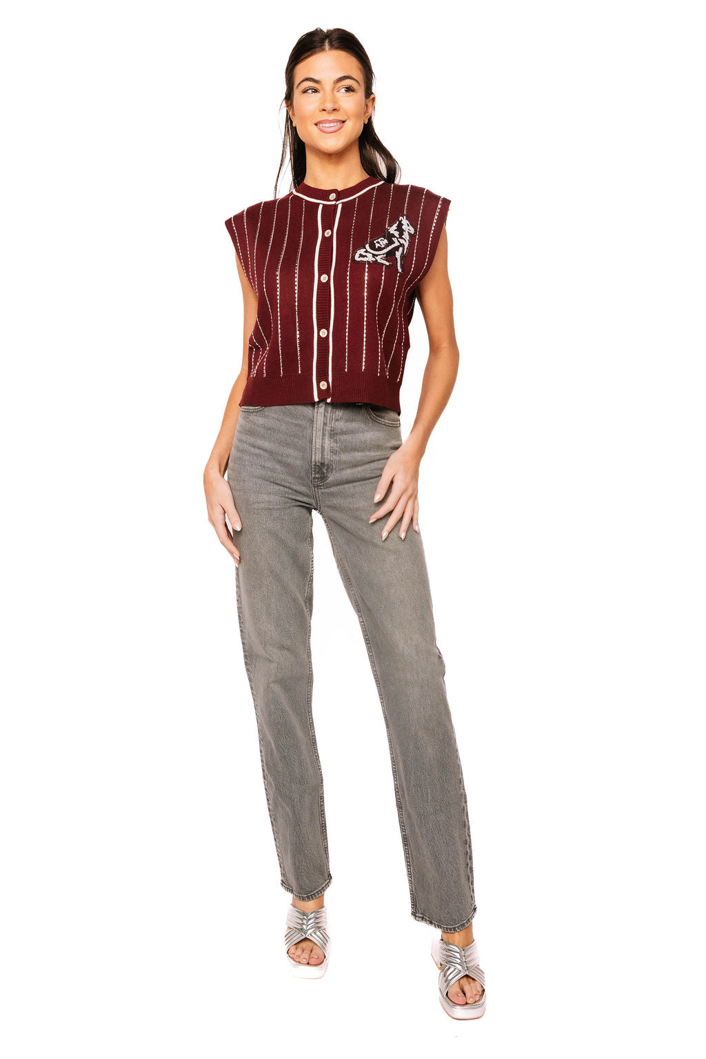 Show your Aggie pride in style with this licensed Texas A&M striped knit vest. Featuring the iconic A&M mascot embroidered on the left chest, this versatile piece layers perfectly over your favorite tee for game day or casual wear. The classic striped knit construction offers comfort and breathability, while the button-up front makes it easy to adjust your look. Whether you're cheering in the stands or showing support around town, this vest combines school spirit with timeless appeal that any Aggie fan will love.