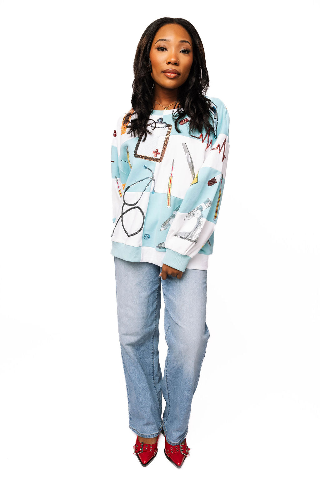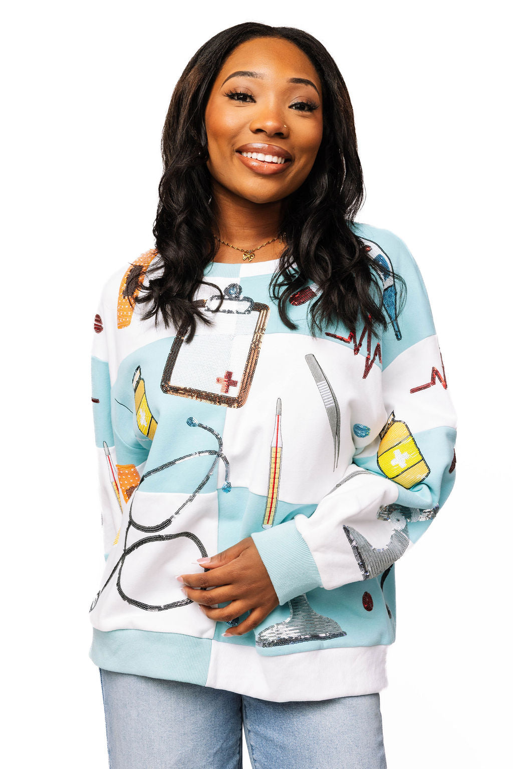 Get ready to turn heads with this adorable light blue and white checkered sweatshirt that celebrates all things medical in the most sparkly way possible! Featuring playful sequin-embellished icons across the front and back—think clipboards, medicine bottles, thermometer, and more—this cozy piece is perfect for healthcare heroes, med students, or anyone who loves a little shimmer with their scrubs aesthetic. The classic checkered pattern keeps things fresh and fun, while the sequin details add that signature Queen of Sparkles glam. Comfortable, quirky, and totally conversation-starting!