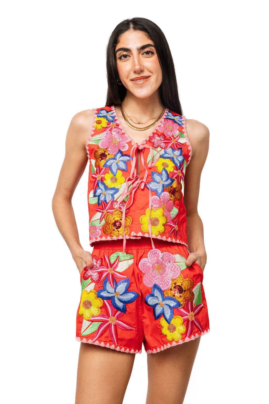 Brighten your summer wardrobe with this vibrant orange cotton tank featuring delicate pink embroidered trim and a burst of multi-colored flowers across the front. The playful tie-up design adds a flirty touch perfect for warm-weather adventures. Pair it with the matching shorts for a coordinated look that's ideal for Cinco de Mayo celebrations, tropical getaways, or simply soaking up the sunshine. Comfortable, colorful, and effortlessly fun—your new seasonal essential.