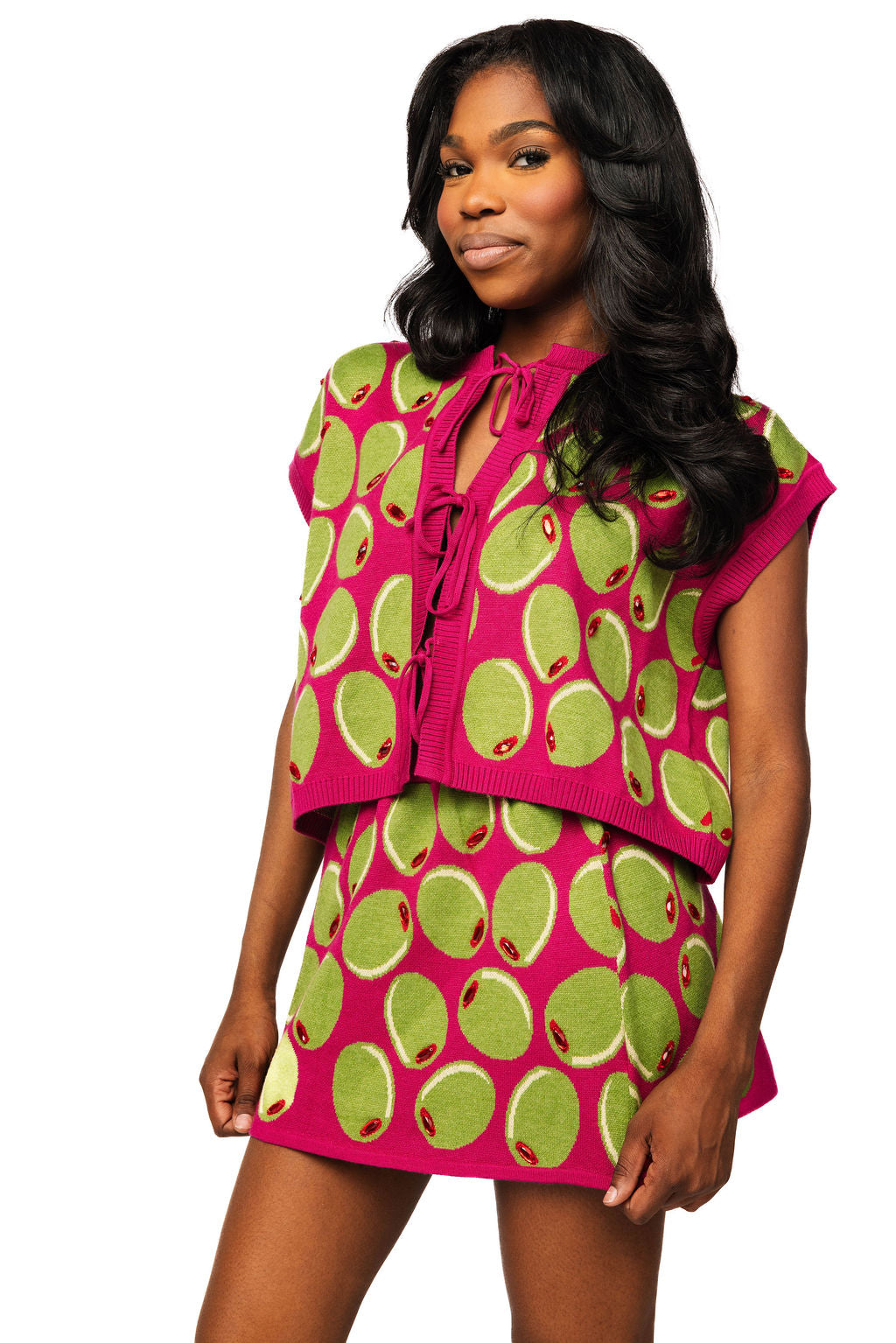 Tie one on with this playful pink tank featuring adorable olive designs scattered throughout. The front tie detail adds a flirty touch that's perfect for showing off your style. Mix and match with our coordinating olive skirt for a look that's totally on-trend and oh-so-cute. Whether you're dressing up for a night out or keeping it casual, this sweet tank is your new go-to piece.