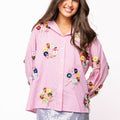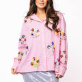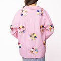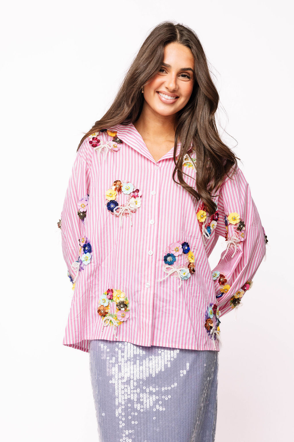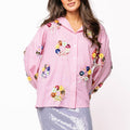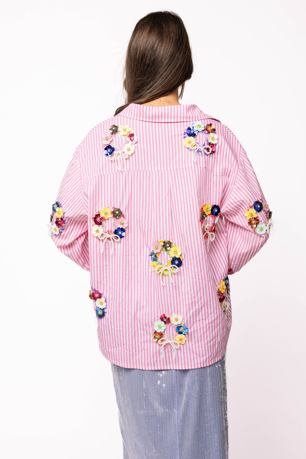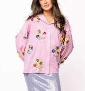 This playful cotton button-up combines classic pink and white stripes with eye-catching sequin flower wreaths on both front and back. Light and breezy, it adds a fun, sparkly twist to your everyday style, perfect for brightening up any outfit with a touch of joyful charm.