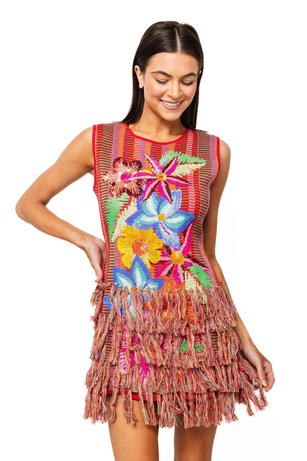 Rainbow Floral Knit Fringe Tank Dress