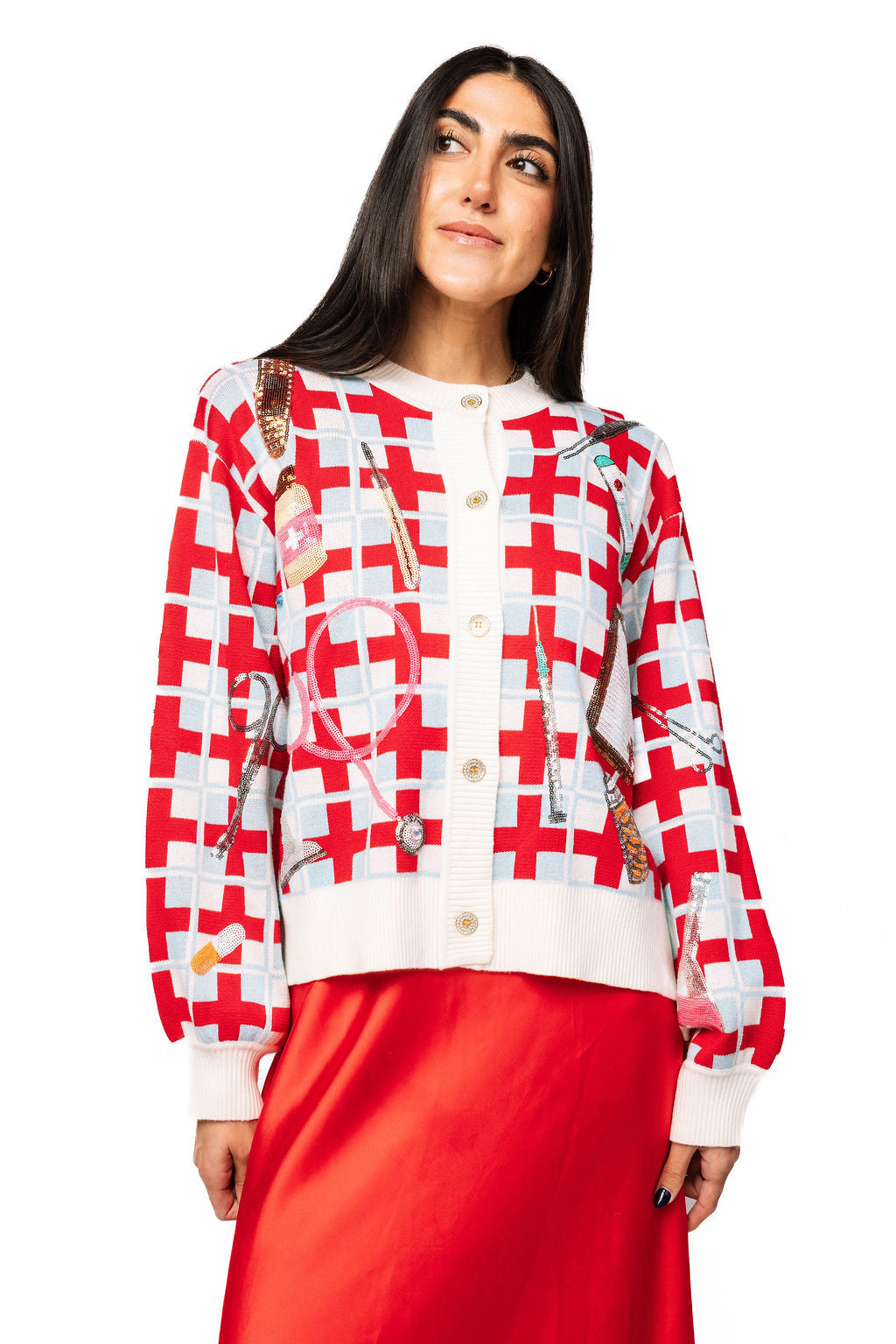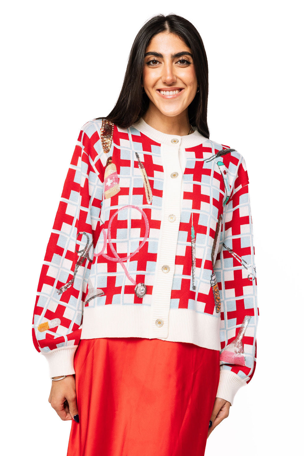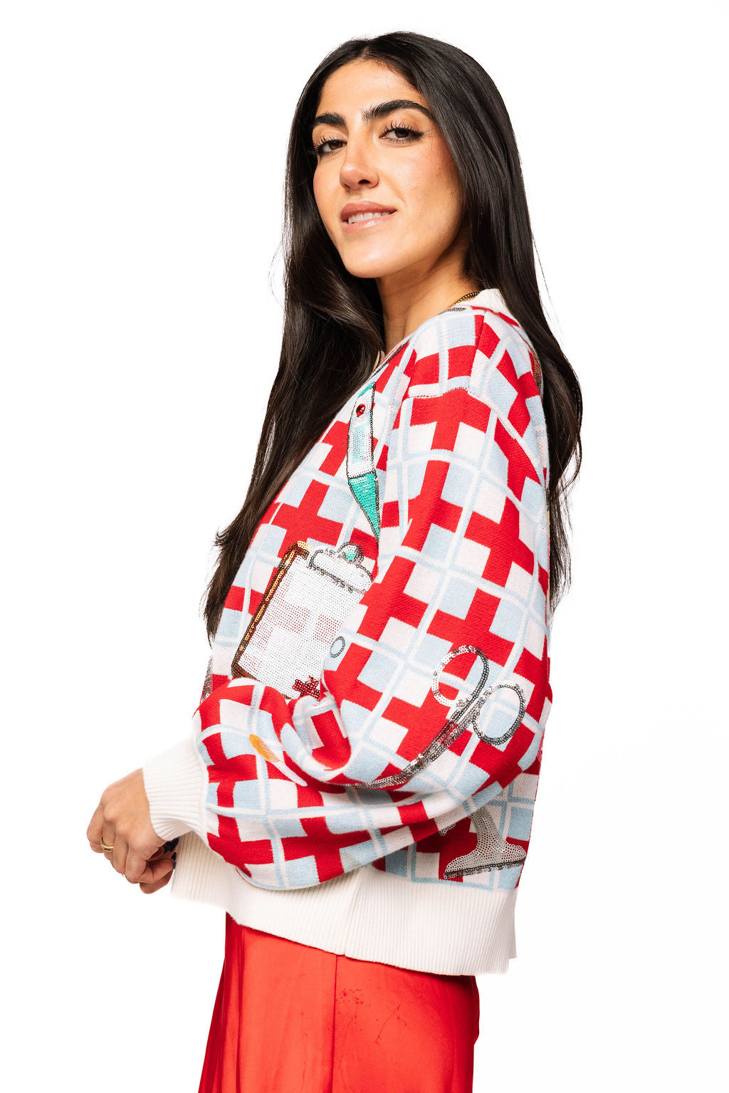 Embrace your inner healthcare hero with this vibrant red and blue cardigan that celebrates the medical profession in style. Scattered sequin medical icons dance across the front and back, adding a sparkly, whimsical touch to your everyday wardrobe. Perfect for nurses, doctors, med students, or anyone who loves a dose of personality with their comfort wear. Layer it over scrubs, casual outfits, or dress it up for a fun night out. This playful piece proves that medical pride has never looked so fabulous.