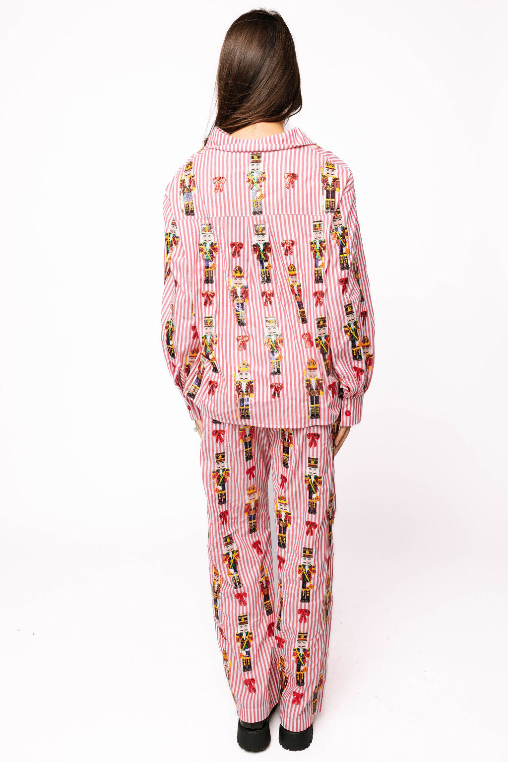 Bring festive fun to your wardrobe with these red and white striped cotton pants, dotted with charming nutcracker and bow designs. Pair them with the matching top for a coordinated, playful look that's perfect for holiday celebrations or cozy winter days. Soft and comfortable, they make spreading cheer effortless and stylish.