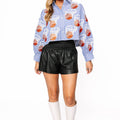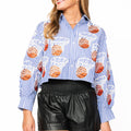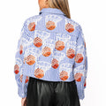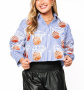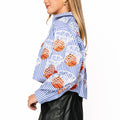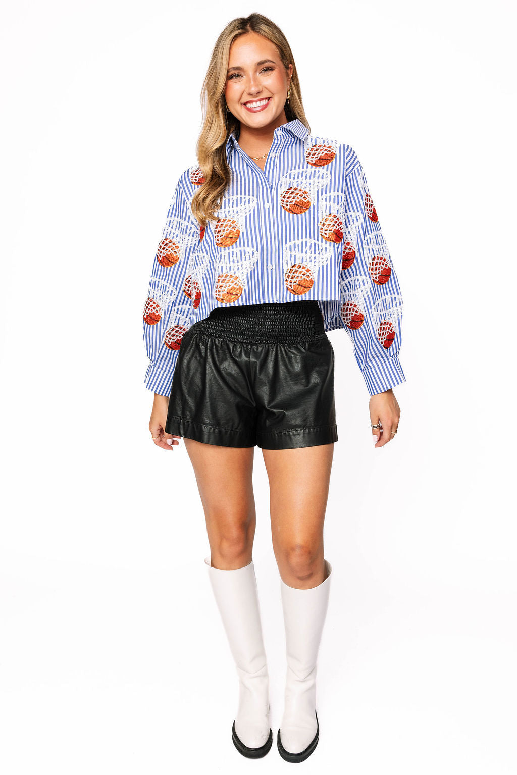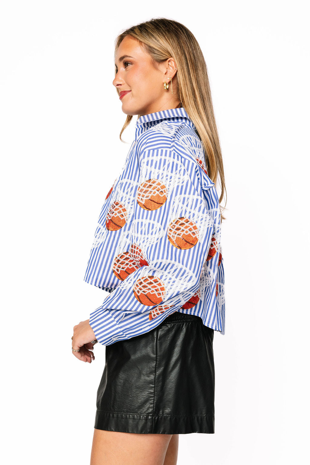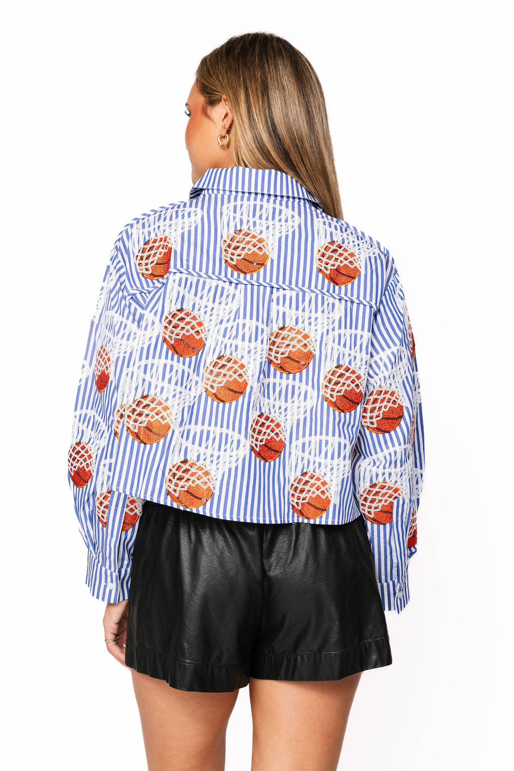 Shoot hoops in style with this playful royal and white striped button-up top featuring an all-over basketball and hoop design. Perfect for court-side vibes or casual game day looks, this piece brings sporty fun to your wardrobe.