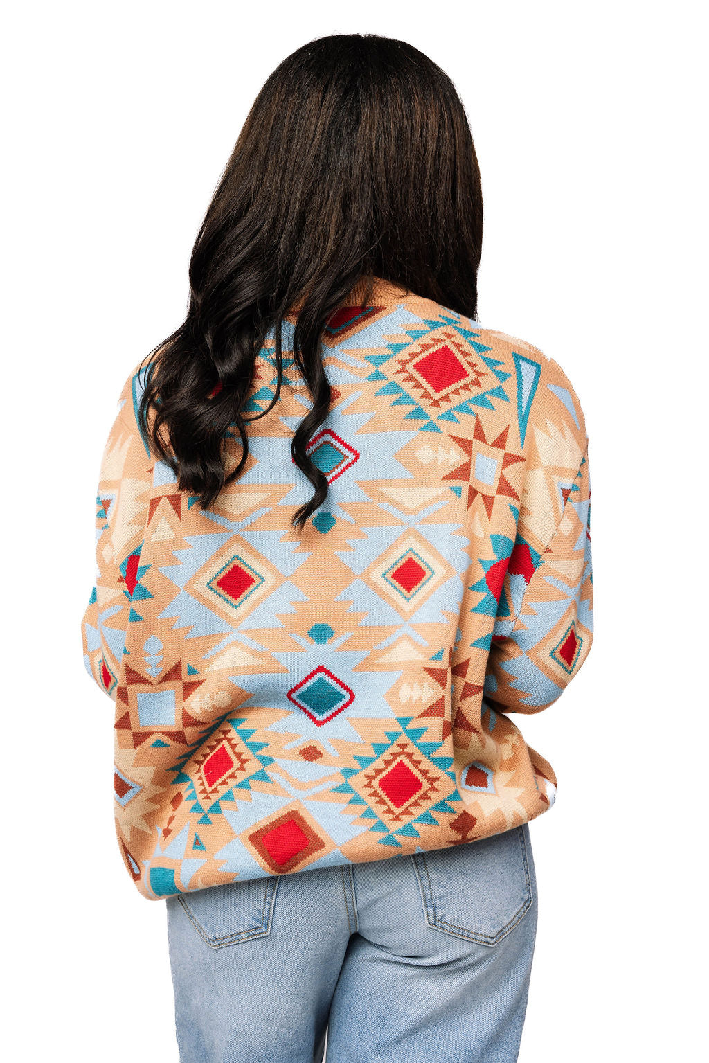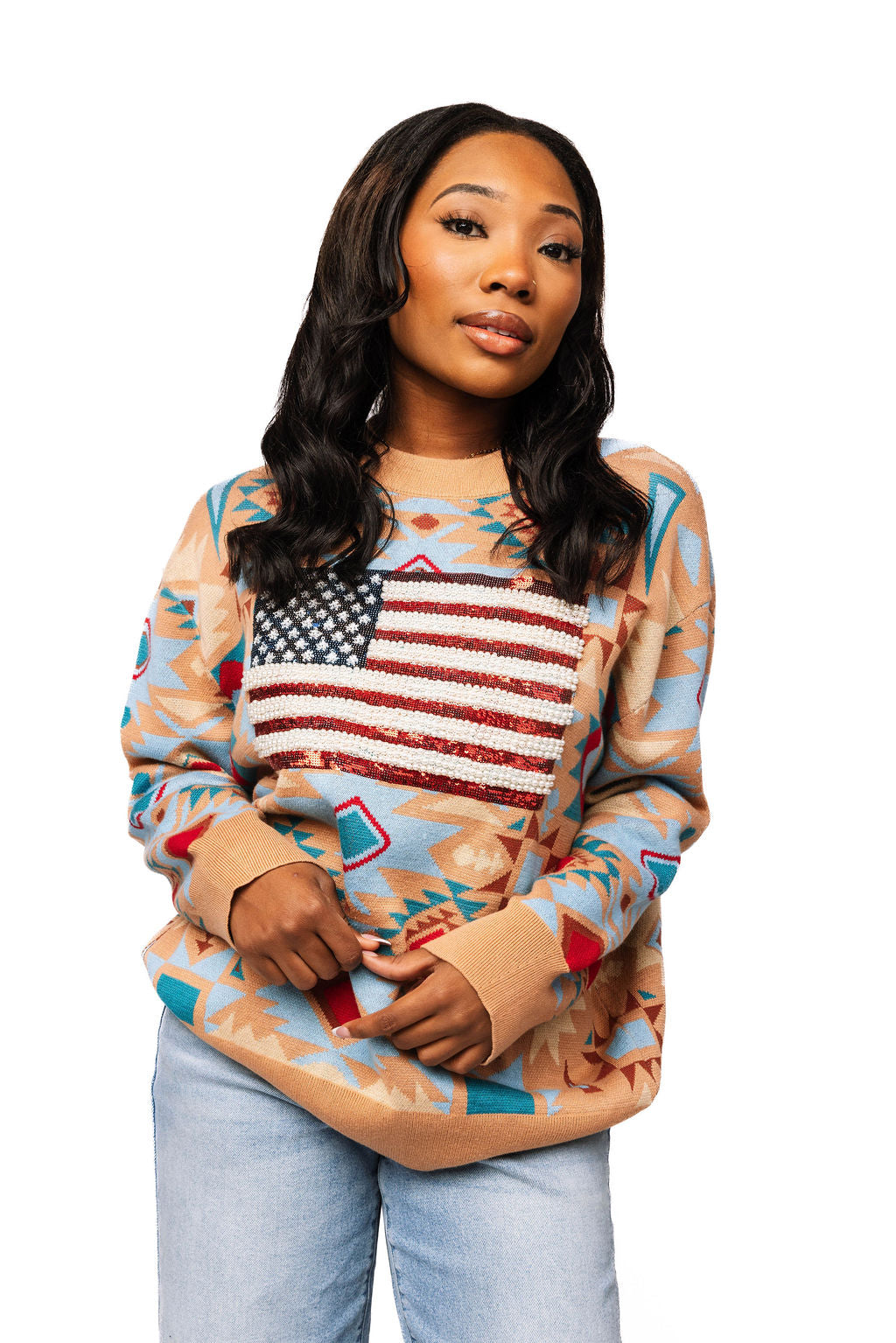 Wrap yourself in patriotic vibes with this show-stopping knit sweater! Featuring a bold aztec print base, the front showcases a stunning beaded American flag that catches the light with every move. Perfect for showing your stars-and-stripes spirit with a fashion-forward twist. This playful piece blends cultural patterns with classic Americana for a look that's totally unique. Whether you're heading to a casual gathering or want to make a statement, this sweater delivers comfort and personality in one fabulous package.