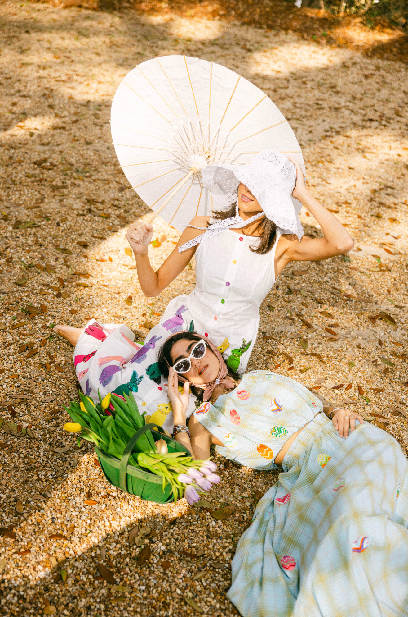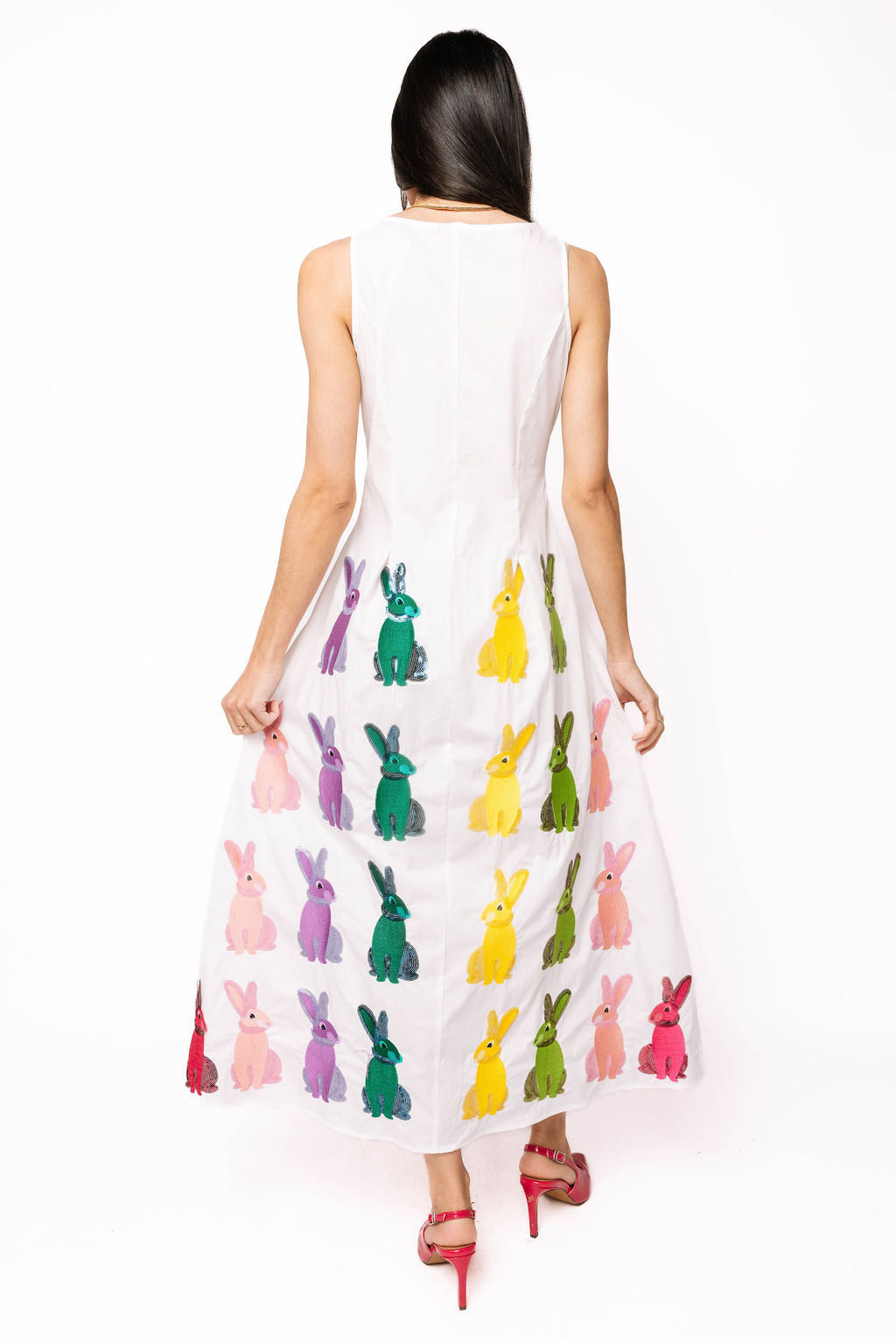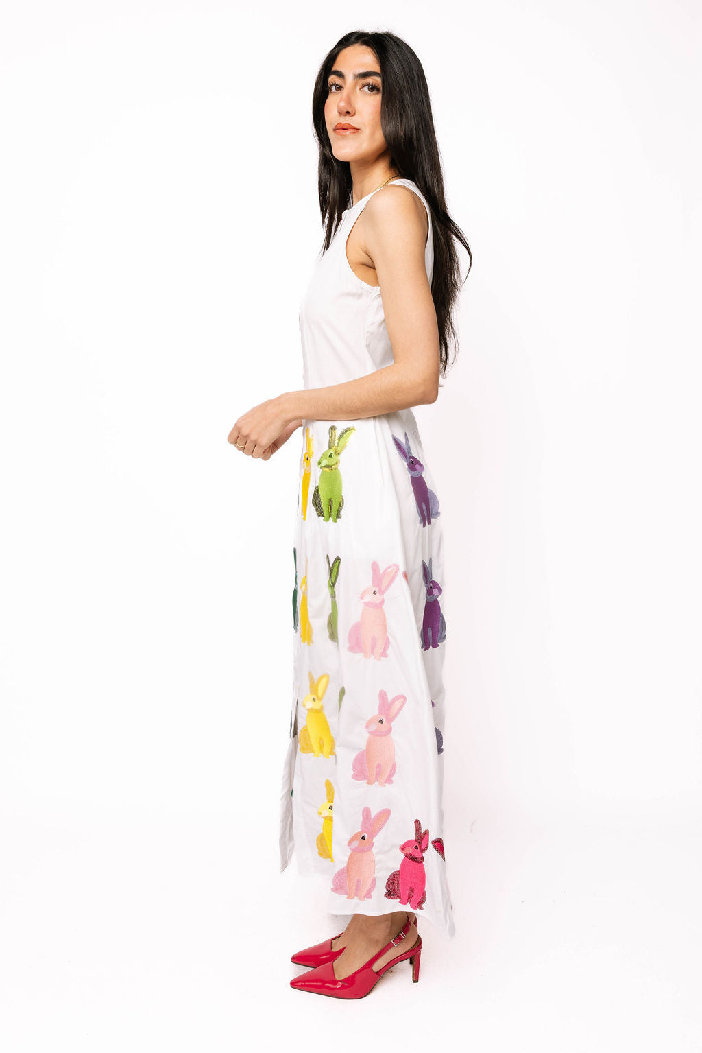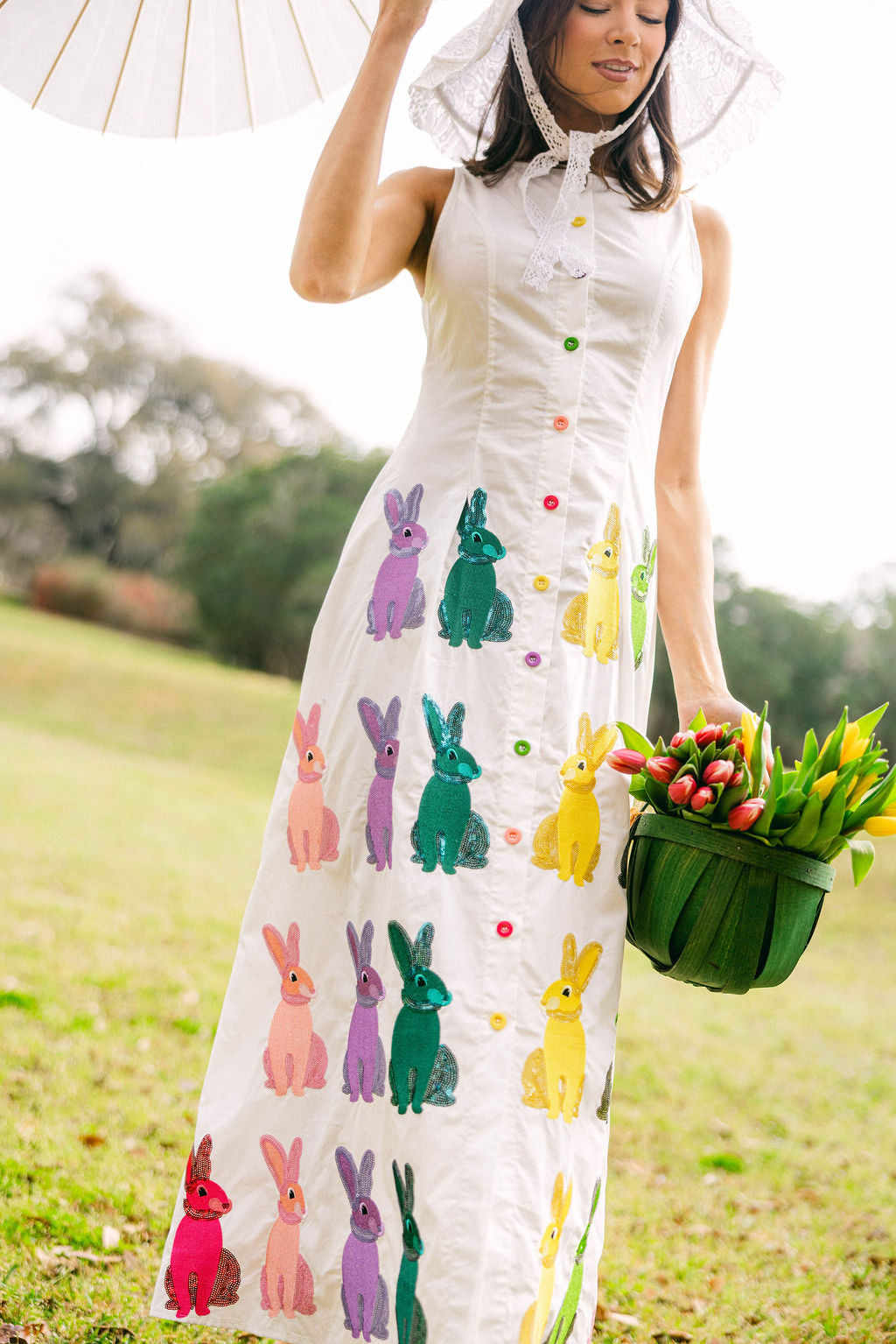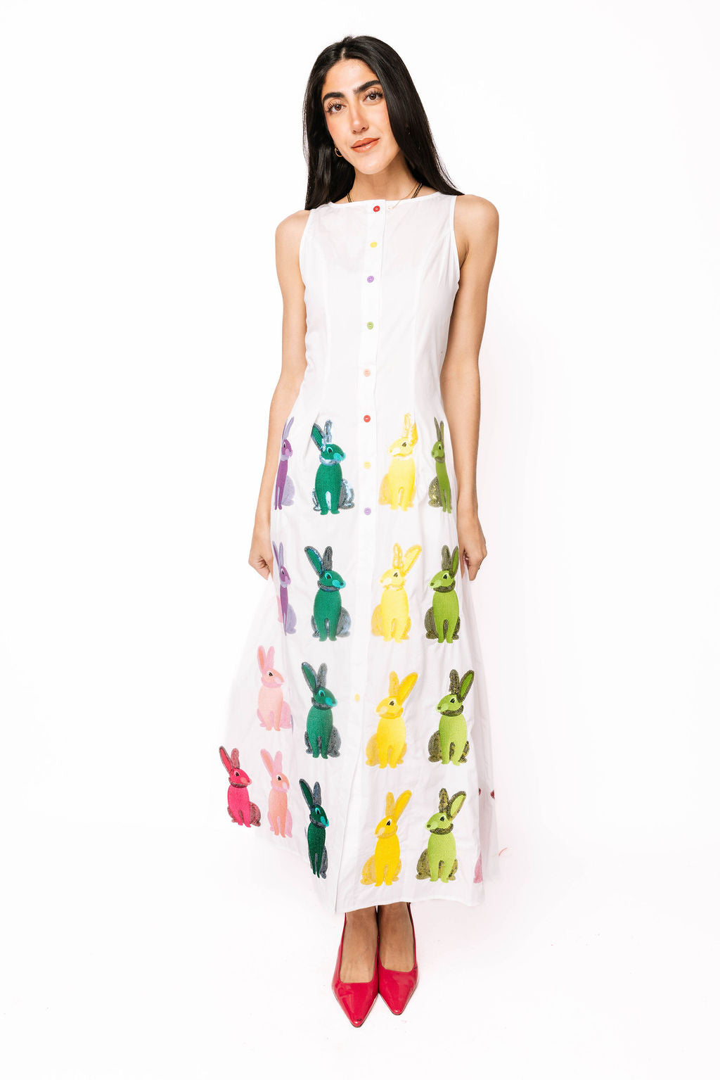 White Multi Easter Bunny Button Up Cotton Midi Dress