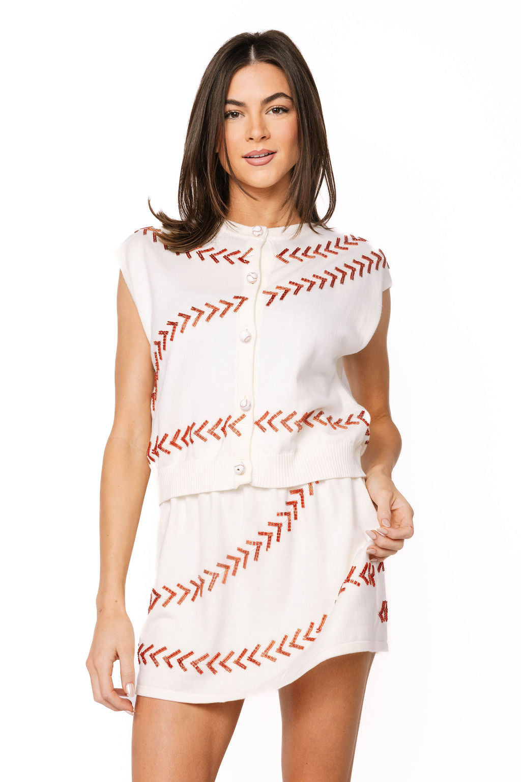 Bring the ballpark energy to your wardrobe with this playful white knit skirt featuring bold red stitching inspired by classic baseball design. The sporty detailing adds instant personality and pairs perfectly with our matching top for a coordinated, head-turning look. Whether you're channeling athletic-chic vibes or just want to stand out, this skirt delivers fun style with an unexpected twist.
